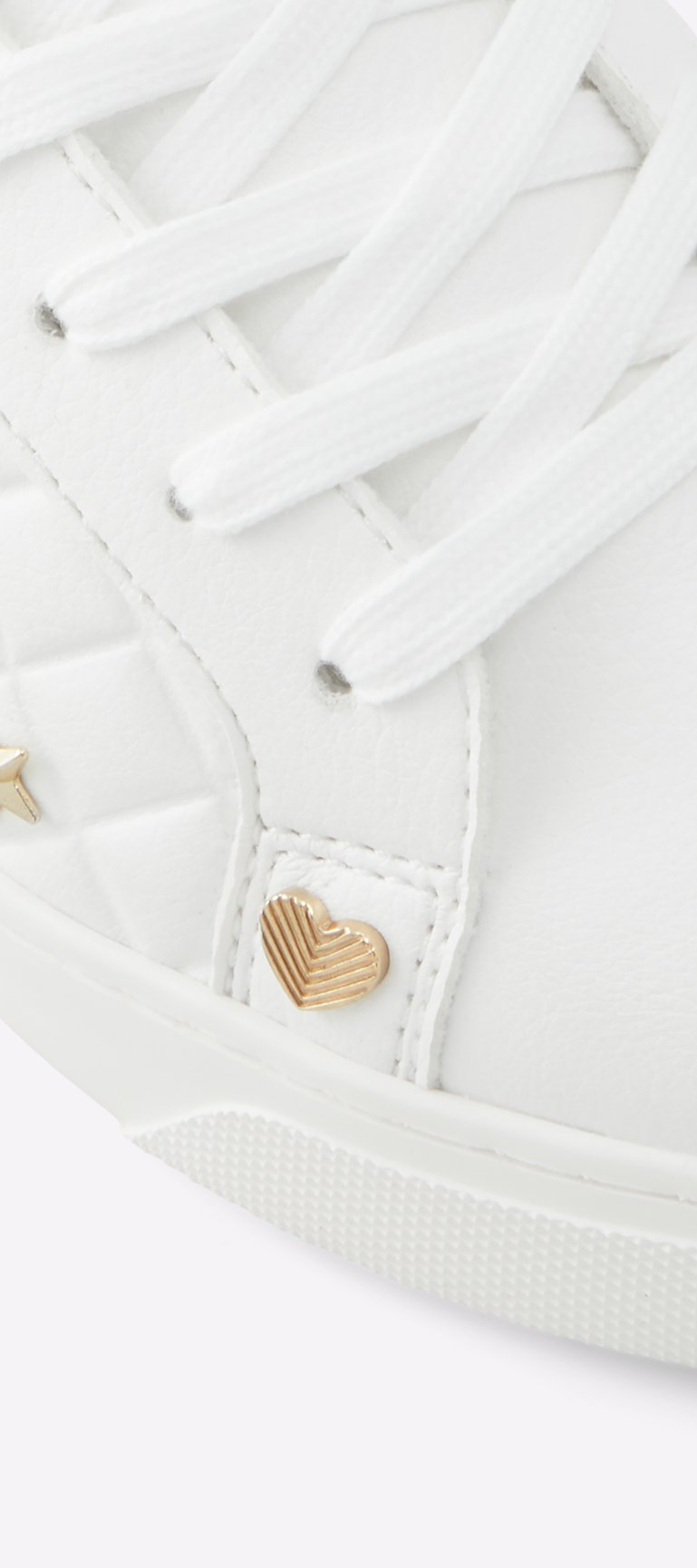 Quilted white sneakers adorned with adorable heart-shaped ornaments? Our hearts are fluttering!