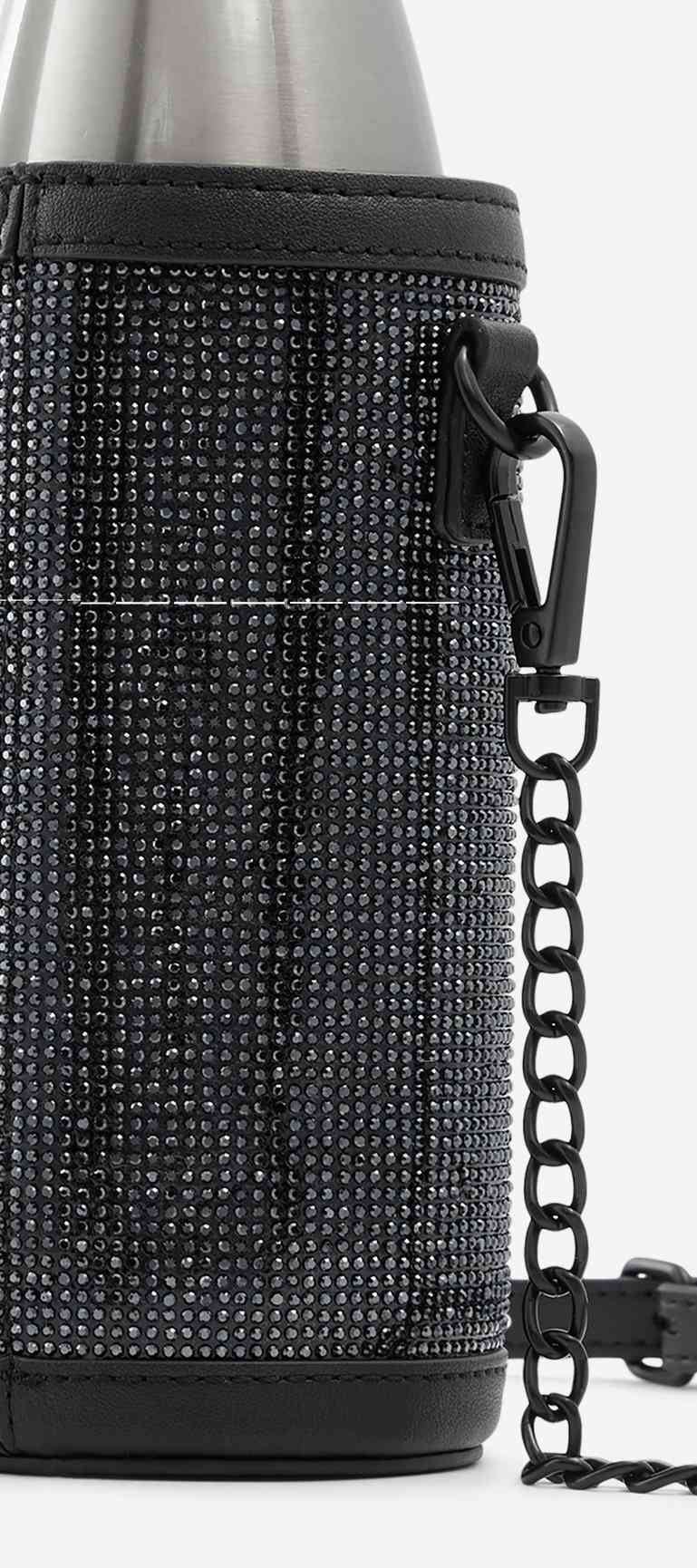 Crossbody water bottle holder features an adjustable chain strap and jeweled exterior. Perfect for a hands-free night out.
