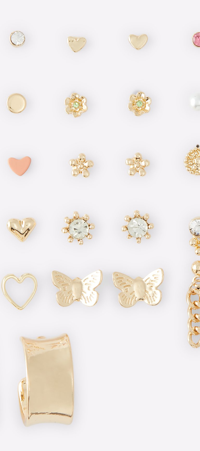 Add a fun vibe to your casual wardrobe with this 25-pair collection of gold-tone earrings. Pastel blush tones with pearl and crystal embellishments transitioning an everyday look to evening glam. A complete range of settings includes ball-shaped or geometric studs, button, hoops and dramatic drop-style.