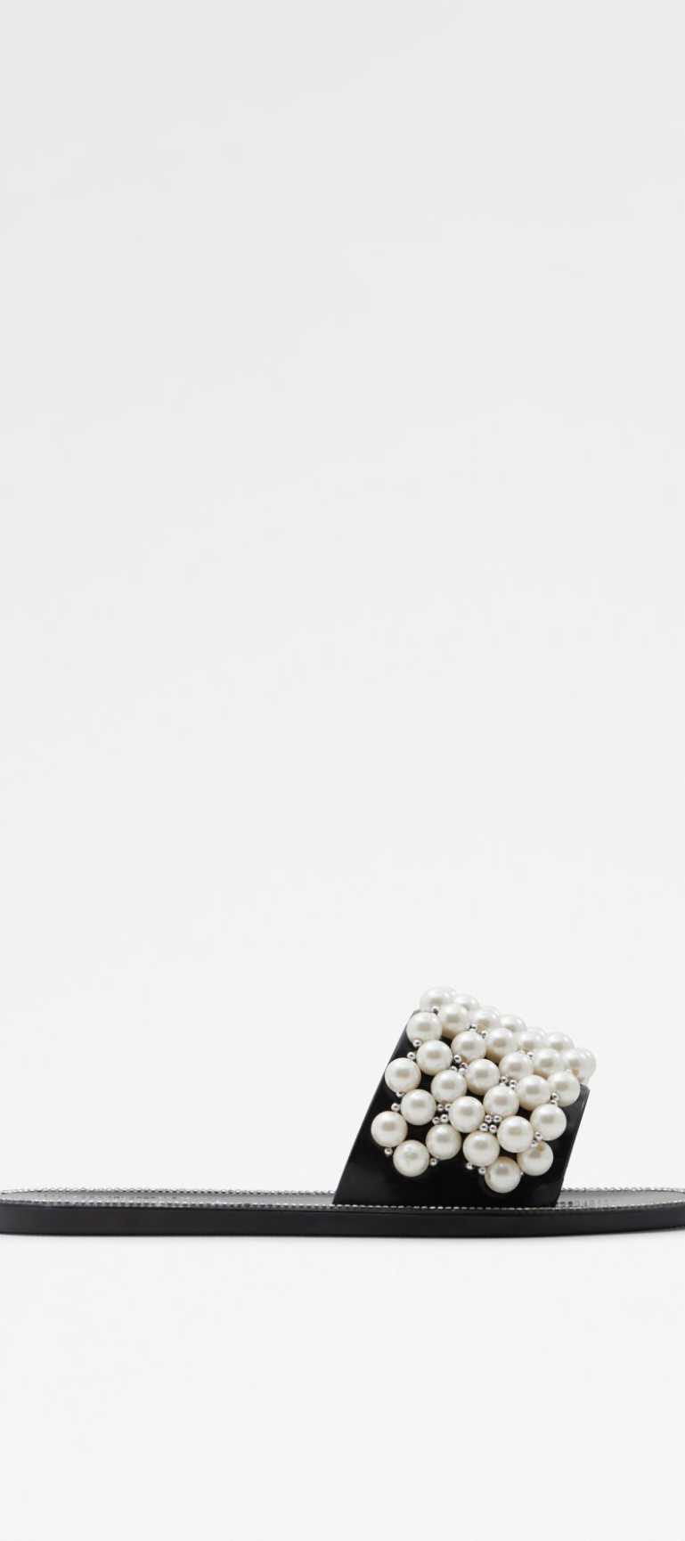 Glam up your casual slip-ons with this fun pair of women’s open-toe sandals. Soft, black soles with matching vamp provide a dramatic backdrop for a sweep of pearls that run from side to side.
