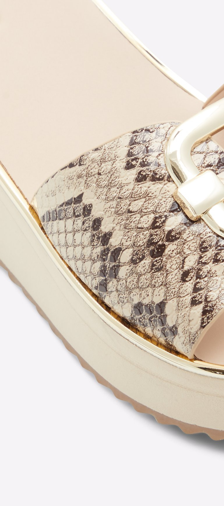Fun, stylish and easy to slip into, these natural tone, snake-print slide-on sandals with open-heel design and thick, platform sole bring a polished finish to any casual look.