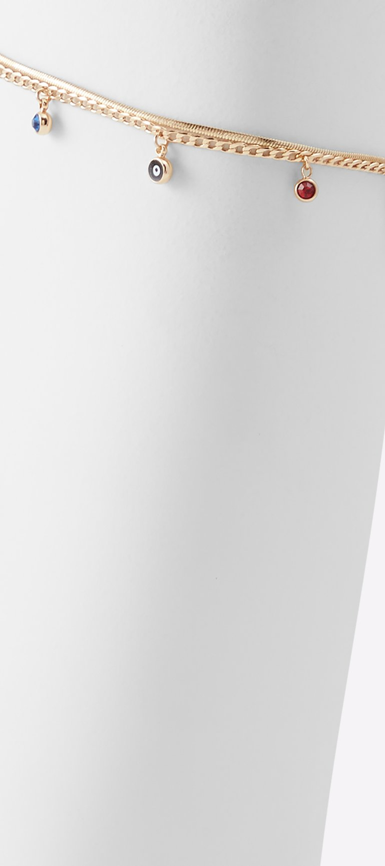 خلخال أنيق يتميز بتصميم سلسلة ذهبية اللون منقطة بحبات صغيرة بلون الكوبالت بزخارف اليد والعين الكلاسيكية