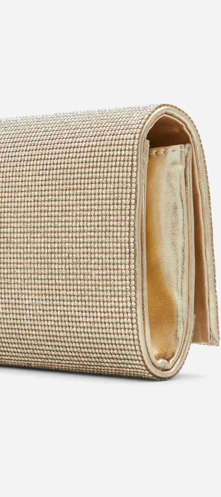 You'll dazzle in this rhinestone-clad clutch! Plus you can go hands-free thanks to the removable chain strap.