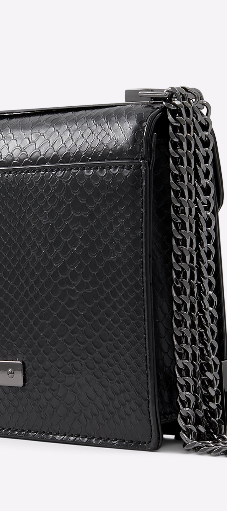 Add some drama to your evening-out look with this cross-body handbag embellished with a slithering snake motif. Jet-black finish features gunmetal hardware for a clean, tone-on-tone look while the double-chain straps add an upmarket vibe. Single-compartment storage holds all the essentials with magnetic snap closure keeping contents out of sight.