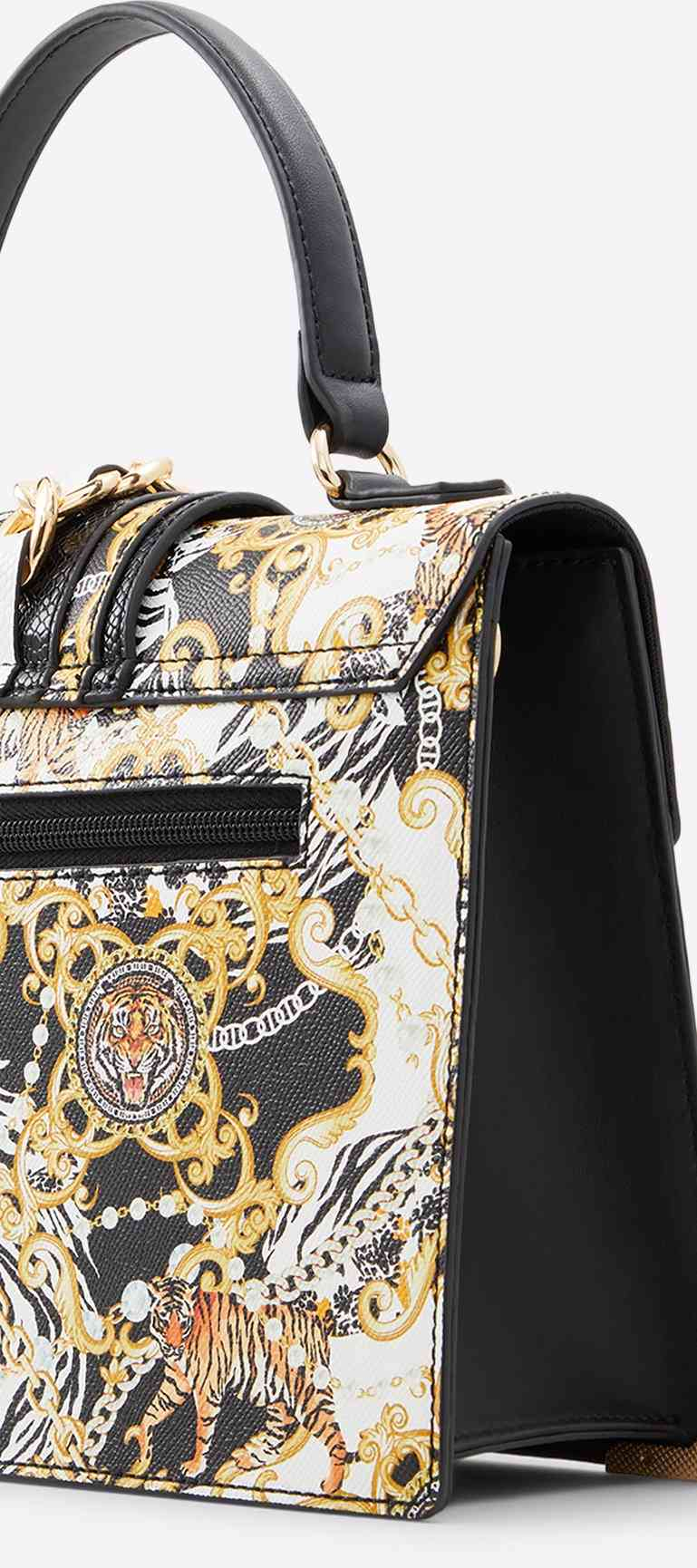 Make a bold statement with this glamorous top handle bag featuring gorgeous metal detailing. Equipped with a magnetic snap for easy access and roomy enough compartments to store all your essentials, this bag is as functional as it is stylish!