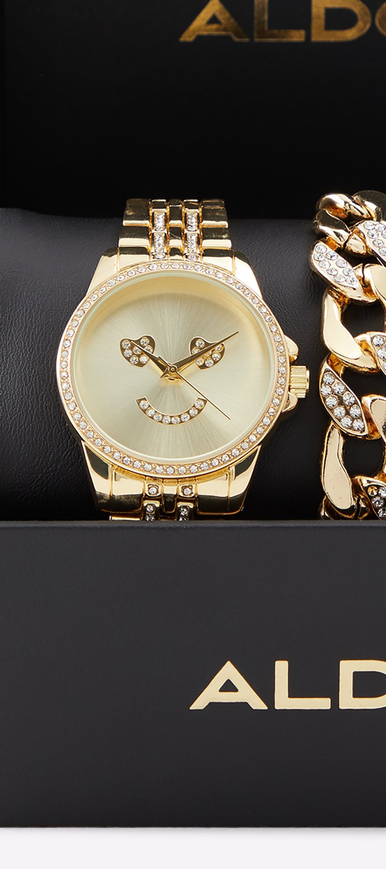 Take a lighthearted approach to accessorizing your wardrobe with this fun, women’s wrist-watch set. Gold-tone bracelet strap features a crystal-studded bezel and matching happy-face design across the dial face. Three bangle and chain-style bracelets finish this look.